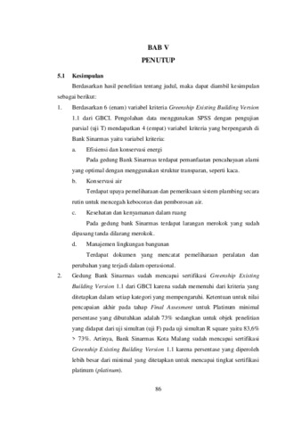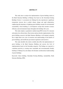 Kata kunci: Green building, Greenship Existing Building, keberlanjutan, Gedung Bank Sinarmas, SPSS.