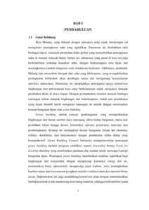 Penelitian ini bertujuan untuk menganalisis penerapan kriteria green building pada Gedung Bank Sinarmas di Kota Malang berdasarkan perangkat penilaian Greenship Existing Building Version 1.1. Kota Malang mengalami peningkatan suhu yang signifikan akibat perubahan iklim global dan urbanisasi yang pesat, yang menekankan pentingnya penerapan konsep bangunan hijau untuk keberlanjutan lingkungan. Green building adalah konsep pembangunan yang memperhatikan efisiensi sumber daya dan dampak lingkungan sepanjang siklus hidup bangunan.