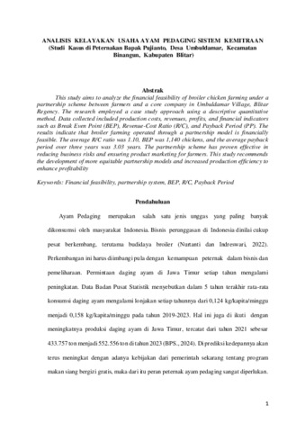 Pujianto, irfan (2025) Analisis Kelayakan Usaha Ayam Pedaging Sistem Kemitraan (Studi asus Di Peternakan Bapak Pujianto, Desa Umbuldamar, Kecamatan Binangun, Kabupaten Blitar). Other thesis, Universitas Islam Balitar, Blitar.