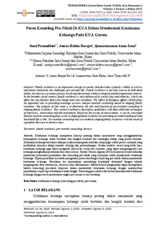 PRAMUDHITA, SANTI (2025) PERAN KONSELING PRA-NIKAH DI KUA DALAM MEMBENTUK KETAHANAN KELUARGA PADA KUA GARUM. Other thesis, Universitas Islam Balitar Blitar.