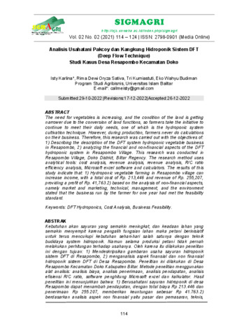Isty, Karlina and Rima Dewi, Oryza Sativa and Tri Kurniastuti, Kurniastuti and Eko Wahyu, Budiman (2022) Analisis Usahatani Pakcoy dan Kangkung Hidroponik Sistem DFT (Deep Flow Technique) Studi Kasus Desa Resapombo Kecamatan Dok. SIGMAGRI, 2 (2): 10. pp. 114-124. ISSN 2798-0901