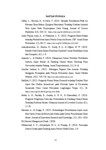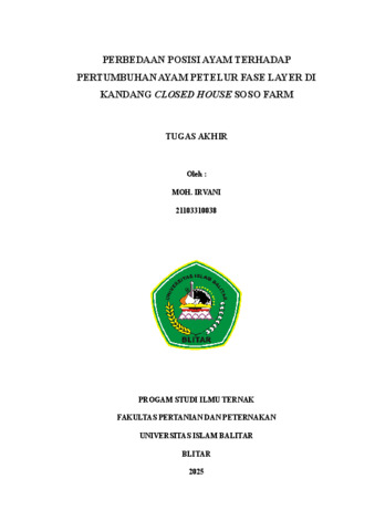 Irvan, Irvani (2025) PERBEDAAN POSISI AYAM TERHADAP PERTUMBUHAN AYAM PETELUR FASE LAYER DI KANDANG CLOSED HOUSE SOSO FARM. Other thesis, Universitas Islam Balitar, Blitar.