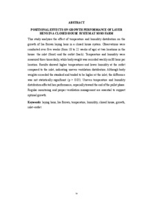 Penelitian ini menganalisis pengaruh distribusi suhu dan kelembaban terhadap pertumbuhan ayam ras petelur strain Isa Brown dalam kandang tertutup (closed house). Pengamatan dilakukan selama lima minggu (umur 18–22 minggu) di dua titik kandang: inlet (depan) dan outlet (belakang). Suhu dan kelembaban diukur tiga kali sehari, sedangkan berat badan ditimbang mingguan pada 80 ekor ayam per lokasi. Hasil menunjukkan suhu outlet lebih tinggi dan kelembaban lebih rendah dibanding inlet, menunjukkan distribusi ventilasi yang tidak merata. Meskipun berat badan ayam melebihi standar dan cenderung lebih tinggi di inlet, perbedaannya tidak signifikan (p > 0,05). Distribusi suhu dan kelembaban yang tidak merata memengaruhi performa ayamdi fase layer. Pemantauan dan pengaturan ventilasi secara berkala penting untuk mendukung pertumbuhan optimal.