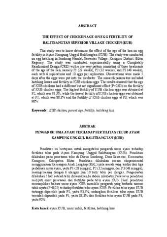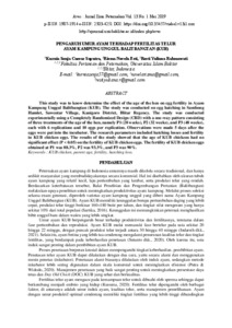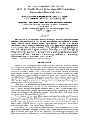 This study was to know determine the effect of the age of the hen on egg fertility in Ayam Kampung Unggul Balitbangtan (KUB). The study was conducted on egg hatching in Sambong Hamlet, Sawentar Village, Kanigoro District, Blitar Regency. The study was conducted experimentally using a Completely Randomized Design (CRD) with a one-way pattern consisting of three treatments of the age of the hen, namely P1 (28 weeks), P2 (32 weeks), and P3 (48 weeks), each with 6 replications and 10 eggs per replication. Observations were made 5 days after the eggs were put into the incubator. The research parameters included hatching losses and fertility in KUB chicken eggs. The results showed that the age of KUB chickens had a different but not significant effect (P>0.05) on the fertility of KUB chicken eggs. The highest fertility of KUB chicken eggs was obtained at P2, which was 93.3%, while the lowest fertility of KUB chicken eggs was obtained at P1, which was 88.3% and the fertility of KUB chicken eggs at P3, which was 90%.