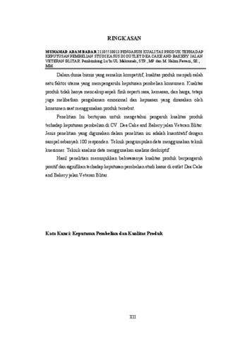 Muhamad Adam Badar, Adam (2025) PENGARUH KUALITAS PRODUK TERHADAP KEPUTUSAN PEMBELIAN STUDI KASUS DI OUTLET DEA CAKE AND BAKERY JALAN VETERAN BLITAR. Other thesis, Universitas Islam Balitar, Blitar.