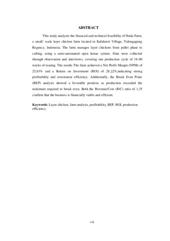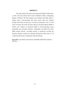 This study analyzes the financial and technical feasibility of Huda Farm, a small- scale layer chicken farm located in Kalidawir Village, Tulungagung Regency, Indonesia. The farm manages layer chickens from pullet phase to culling, using a semi-automated open house system. Data were collected through observation and interviews, covering one production cycle of 18-80 weeks of rearing. The results The farm achieved a Net Profit Margin (NPM) of 25,83% and a Return on Investment (ROI) of 28,22%,indicating strong profitability and investment efficiency. Additionally, the Break Even Point (BEP) analysis showed a favorable position, as production exceeded the minimum required to break even. Both the Revenue/Cost (R/C) ratio of 1,35 confirm that the business is financially viable and efficient.