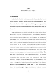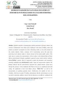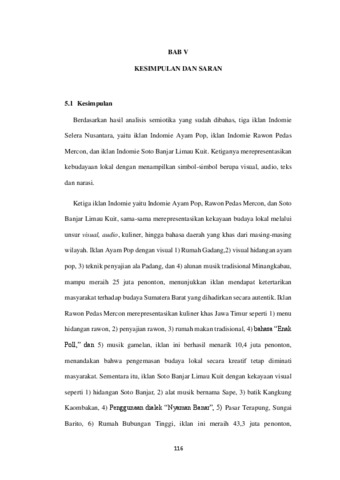 Kesimpulan dari hasil dan pembahasan menunjukan dalam iklan Indomie Ayam Pop, budaya Minangkabau tergambar melalui visual Rumah Gadang, hidangan Ayam Pop, penyajian khas rumah makan Padang, serta musik tradisional seperti rabab dan talempong. Kemudian, Indomie Rawon Pedas Mercon merepresentasikan budaya Jawa Timur melalui hidangan Rawon, latar rumah makan tradisional, bahasa lokal seperti “Enak Poll” dan musik gamelan. Sementara itu, Indomie Soto Banjar Limau Kuit mengangkat budaya Kalimantan Selatan melalui hidangan Soto Banjar, dialek lokal “Nyaman Banar”, alat musik petik bernama Sape, motif batik Kangkung Kaombakan, serta latar Pasar Terapung dan Rumah Bubungan Tinggi. Setiap elemen dalam iklan Indomie tersebut membentuk representasi kuat terhadap identitas kebudayaan lokal daerah masing-masing.