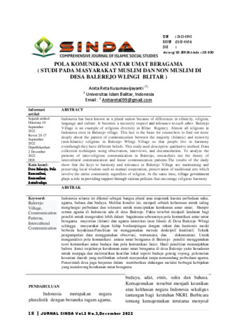 Kusumawijayanti, Anita Reta (2022) POLA KOMUNIKASI ANTAR UMAT BERAGAMA (STUDI PADA MASYARAKAT MUSLIM DAN NON MUSLIM DI DESA BALEREJO WLINGI BLITAR ). SINDA: Comprehensive Journal of Islamic Social Students, 2 (3). pp. 18-27. ISSN 2615-1995