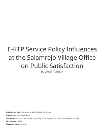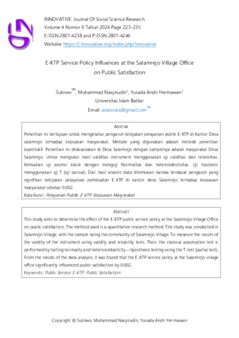 Sutowo, Sutowo and Nasyirudin, Muhammad and Hermawan, Yusada Andri (2024) E-KTP Service Policy Influences at the Salamrejo Village Office on Public Satisfaction. INNOVATIVE: Journal Of Social Science Research, 4 (6). pp. 223-235. ISSN 2807-4238