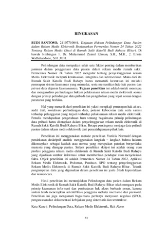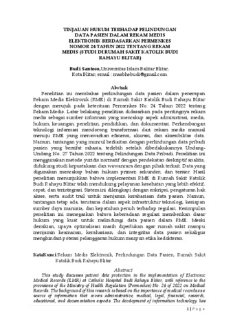 Santoso, Budi (2025) TINJAUAN HUKUM TERHADAP PELINDUNGAN DATA PASIEN DALAM REKAM MEDIS ELEKTRONIK BERDASARKAN PERMENKES NOMOR 24 TAHUN 2022 TENTANG REKAM MEDIS (STUDI DI RUMAH SAKIT KATOLIK BUDI RAHAYU BLITAR). Other thesis, Universitas Islam Balitar.