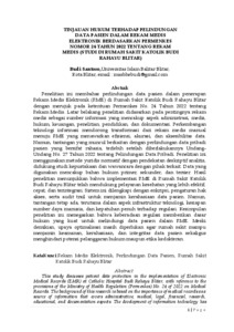 Pelindungan data merupakan salah satu faktor penting dalam memberikan jaminan dalam penggunaan data pasien dalam rekam medis rumah sakit. Permenkes Nomor 24 Tahun 2022 mengatur tentang penyelenggaraan rekam Medis Elektronik meliputi kerahasiaan, integritas dan ketersediaan. Maka dari itu Rumah Sakit Katolik Budi Rahayu harus mematuhi ketentuan ini melalui penerapan sistem keamanan yang memadai, serta memastikan hak-hak pasien dan privasi data dijamin keamanannya. Tujuan penelitian ini adalah untuk meninjau dan menganalisis perlindungan hukum pelaksanaan rekam medis elektronik sesuai dengan prinsip pelindungan data pribadi dan pengelolaan yang tepat sesuai dengan peraturan yang berlaku.