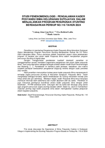 Dewi, Lalang Alma Lian (2025) STUDI FENOMENOLOGIS : PENGALAMAN KADER POSYANDU BIMA KELURAHAN SUTOJAYAN DALAM MENJALANKAN PROGRAM PENURUNAN STUNTING BERDASARKAN PERBUP NO.116 TAHUN 2024. Other thesis, Universitas Islm Blitar.