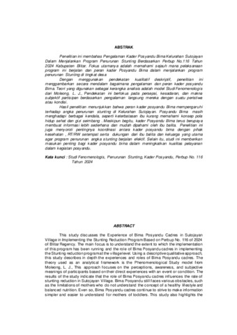 Kata Kunci : Studi Fenomenologis, Penurunan Stunting, Kader Posyandu, Perbup No. 116 Tahun 2024