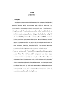 Hasil penelitian menunjukkan bahwa kader memiliki dan memainkan peran penting sebagai ujung tombak edukasi dan pelayanan kesehatan dasar, terutama dalam mengedukasi dan memberi penyuluhan ibu balita tentang nutrisi, melacak tumbuh kembang atau perkembangan anak, dan rutin melakukan posyandu. Namun, kader menghadapi beberapa tantangan, termasuk kurangnya partisipasi masyarakat, kekurangan sumber daya, dan kurangnya pelatihan lanjutan. Karena rasa tanggung jawab sosial dan dukungan dari perangkat desa, Secara keseluruhan, kader Posyandu BIMA di Kelurahan Sutojayan memiliki pengalaman yang baik dalam melaksanakan program penurunan Stunting yang diatur oleh Perbup No. 116 Tahun 2024. Ini menunjukkan bahwa mereka berperan penting sebagai agen perubahan di desa. Kader mampu melaksanakan tugasnya dengan baik dan berkontribusi besar dalam menurunkan angka Stunting meskipun menghadapi tantangan. Oleh karena itu, peningkatan peran kader melalui pelatihan yang tepat dan penerapan kebijakan yang mendukung merupakan kunci utama dalam menurunkan Stunting dan meningkatkan kualitas kesehatan masyarakat di Kelurahan Sutojayan.