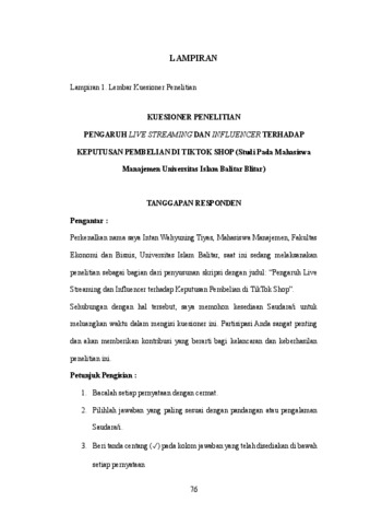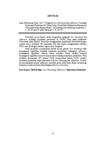Tiyas, Intan Wahyuning (2025) PENGARUH LIVE STREAMING DAN INFLUENCER TERHADAP KEPUTUSAN PEMBELIAN DI TIKTOK SHOP (STUDI PADA MAHASISWA MANAJEMEN UNIVERSITAS ISLAM BALITAR BLITAR). Other thesis, Universitas Islam Balitar.