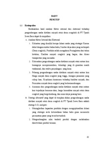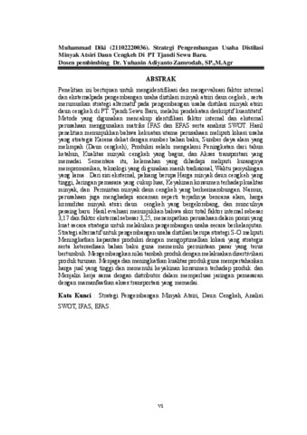 Penelitian ini bertujuan untuk mengidentifikasi dan mengevaluasi faktor internal dan eksternalpada pengembangan usaha distilasi minyak atsiri daun cegkeh , serta merumuskan strategi alternatif pada pengembangan usaha distilasi minyak atsiri daun cengkeh di PT. Tjandi Sewu Baru, melalui pendekatan deskriptif kuantitatif. Metode yang digunakan mencakup identifikasi faktor internal dan eksternal perusahaan menggunakan matriks IFAS dan EFAS serta analisis SWOT. Hasil penelitian menunjukkan bahwa kekuatan utama perusahaan meliputi lokasi usaha yang strategis Karena dekat dengan sumber bahan baku, Sumber daya alam yang melimpah (Daun cengkeh), Produksi selalu mengalami Peningkatan dari tahun ketahun, Kualitas minyak cengkeh yang bagus, dan Akses transportasi yang memadai. Sementara itu, kelemahan yang dihadapi meliputi kurangnya mempromosikan, teknologi yang di gunakan masih tradisional, Waktu penyulingan yang lama . Dari sisi eksternal, peluang berupa Harga minyak daun cengkeh yang tinggi, Jaringan pemasara yang cukup luas, Keyakinan konsumen terhadap kualitas minyak, dan Permintan minyak daun cengkeh yang berkesinambungan. Namun, perusahaan juga menghadapi ancaman seperti terjadinya bencana alam, harga komuditas minyak atsiri daun cengkeh yang bergelombang, dan munculnya pesaing baru. Hasil evaluasi menunjukkan bahwa skor total faktor internal sebesar 3,17 dan faktor eksternal sebesar 3,25, menempatkan perusahaan dalam posisi yang kuat secara strategis untuk melakukan pengembangan usaha secara berkelanjutan. Strategi alternatif untuk pengembangan usaha distilasi berupa strategi S-O meliputi Meningkatkan kapasitas produksi dengan mengoptimalkan lokasi yang strategis serta ketersediaan bahan baku guna memenuhi permintaan pasar yang terus bertumbuh. Mengembangkan nilai tambah produk dengan melakuakan disertivikasi produk turunan. Menjaga dan meningkatkan kualitas produk guna mempertahankan harga jual yang tinggi dan memenuhi keyakinan konsumen terhadap produk. dan Menjalin kerja sama dengan distributor dalam memperluas jaringan pemasaran dengan mamanfaatkan akses transportasi yang memadai.