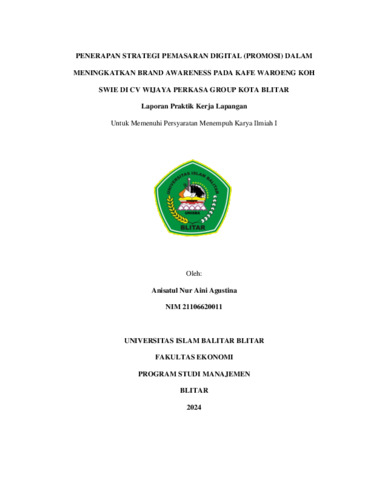Anisatul Nur Aini Agustina, Anisatul (2025) PENERAPAN STRATEGI PEMASARAN DIGITAL (PROMOSI) DALAM MENINGKATKAN BRAND AWARENESS PADA KAFE WAROENG KOH SWIE DI CV WIJAYA PERKASA GROUP KOTA BLITAR. Technical Report. UNIVERSITAS ISLAM BALITAR, BLITAR. (Unpublished)