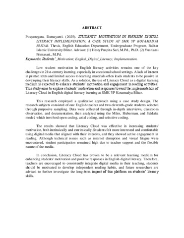 Puspanegara, Damayanti (2025) STUDENTS’ MOTIVATION IN ENGLISH DIGITAL LITERACY IMPLEMENTATION: A CASE STUDY AT SMK YP KOTAMADYA BLITAR. Other thesis, Universitas Islam Balitar, Blitar.