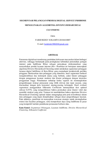 Sukamto, Farid Rizky (2025) SEGMENTASI PELANGGAN PRODUK DIGITAL SERVICE INDIHOME MENGGUNAKAN ALGORITMA DIVISIVE HIERARCHICAL CLUSTERING. Other thesis, Universitas Islam Balitar, Blitar.