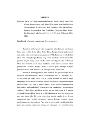 Rofianica, Mella (2025) PENGEMBANGAN BAHAN AJAR BOOKLET BALITAR (BACA TULIS HITUNG BANGUN RUANG) PADA MATERI MATEMATIKA UNTUK PEMBELAJARAN NUMERASI KELAS IV SD. Other thesis, Universitas Islam Balitar.