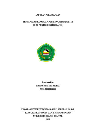 RATNA DIVA TRI MULIA, LIA (2025) LAPORAN PELAKSANAAN PENGENALAN LAPANGAN PERSEKOLAHAN (PLP) III DI SD NEGERI GEMBONGAN 02. Technical Report. UNIVERSITAS ISLAM BALITAR, BLITAR. (Unpublished)