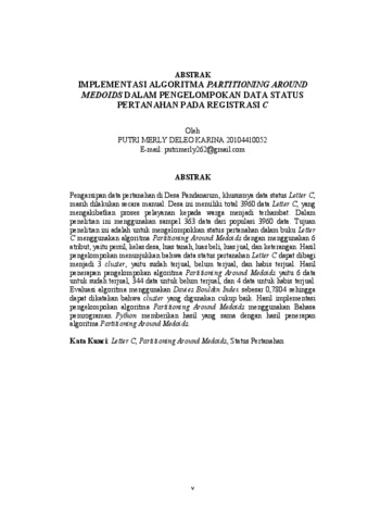 Pengarsipan data pertanahan di Desa Pandanarum, khususnya data status Letter C, masih dilakukan secara manual. Desa ini memiliki total 3960 data Letter C, yang mengakibatkan proses pelayanan kepada warga menjadi terhambat. Dalam penelitian ini menggunakan sampel 363 data dari populasi 3960 data. Tujuan penelitian ini adalah untuk mengelompokkan status pertanahan dalam buku Letter C menggunakan algoritma Partitioning Around Medoids dengan menggunakan 6 atribut, yaitu persil, kelas desa, luas tanah, luas beli, luas jual, dan keterangan. Hasil pengelompokan menunjukkan bahwa data status pertanahan Letter C dapat dibagi menjadi 3 cluster, yaitu sudah terjual, belum terjual, dan habis terjual. Hasil penerapan pengelompokan algoritma Partitioning Around Medoids yaitu 6 data untuk sudah terjual, 344 data untuk belum terjual, dan 4 data untuk habis terjual. Evaluasi algoritma menggunakan Davies Bouldin Index sebesar 0,7804 sehingga dapat dikatakan bahwa cluster yang digunakan cukup baik. Hasil implementasi pengelompokan algoritma Partitioning Around Medoids menggunakan Bahasa pemrograman Python memberikan hasil yang sama dengan hasil penerapan algoritma Partitioning Around Medoids.