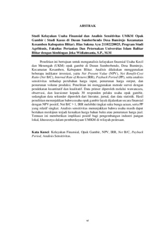 Sukma Ayu, Hias (2025) STUDI KELAYAKAN USAHA FINANSIAL DAN ANALISIS SENSITIVITAS UMKM OPAK GAMBIR (Studi Kasus di Dusun Sumberbendo Desa Bumirejo Kecamatan Kesamben Kabupaten Blitar). Other thesis, Universitas Islam Balitar Blitar.