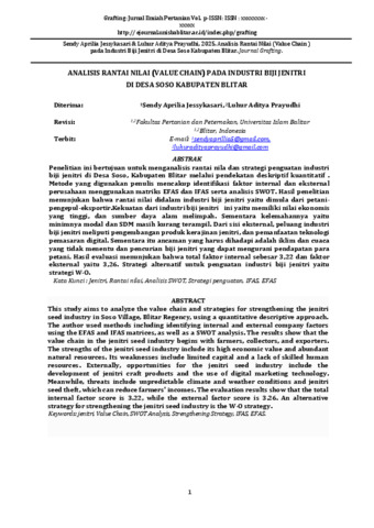 Penelitian ini bertujuan untuk menganalisis rantai nilai dan strategi penguatan industri biji jenitri di Desa Soso, Kabupaten Blitar melalui pendekatan deskriptif kuantitatif. Metode yang digunakan penulis mencakup identifikasi faktor internal dan eksternal perusahaan menggunakan matriks EFAS dan IFAS serta analisis SWOT. Hasil penelitian menunjukan bahwa ranta nilai didalam industri biji jenitri yaitu dimula dari petani-pengepul-eksportir.Kekuatan dari industri biji jenitri ini yaitu memiliki nilai ekonomis yang tinggi, dan sumber daya alam melimpah. Sementara kelemahannya yaitu minimnya modal dan SDM masih kurang terampil. Dari sisi eksternal, peluang industri biji jenitri meliputi pengembangan produk kerajinan jenitri, dan pemanfaatan teknologi pemasaran digital. Sementara itu ancaman yang harus dihadapi adalah iklim dan cuaca yang tidak menentu dan pencurian biji jenitri yang dapat mengurani pendapatan para petani. Hasil evaluasi menunjukan bahwa total faktor internal sebesar 3,22 dan faktor eksternal yaitu 3,26. Strategi alternatif untuk penguatan industri biji jenitri yaitu strategi W-O meliputi meningkatkan promosi digital dan pemasaran online untuk mengatasi kurangnya pengenalan produk. Melatih dan meningkatkan keterampilan SDM agar lebih sejalan dengan pengembangan produk teknologi pemasaran digital.