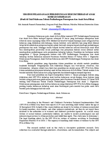 Siti Aminah Prasasti Ramandani, Siti Aminah URGENSI PELAKSANAAN PERLINDUNGAN HUKUM TERHADAP ANAK KORBAN KEKERASAN (Studi di Unit Pelaksana Teknis Perlindungan Perempuan dan Anak Kota Blitar). URGENSI PELAKSANAAN PERLINDUNGAN HUKUM TERHADAP ANAK KORBAN KEKERASAN (Studi di Unit Pelaksana Teknis Perlindungan Perempuan dan Anak Kota Blitar). (Unpublished)