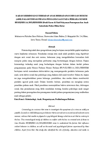 Felisia, Kusnul KAJIAN KRIMINOLOGI TERHADAP ANAK BERHADAPAN DENGAN HUKUM (ABH) DALAM TINDAK PIDANA PENGANIAYAAN PADA PERKARA NOMOR BP/9/II/RES.1.6./2021/RESKRIM (Studi Kasus di Unit Pelayanan Perempuan dan Anak Satreskrim Polres Blitar Kota). KAJIAN KRIMINOLOGI TERHADAP ANAK BERHADAPAN DENGAN HUKUM (ABH) DALAM TINDAK PIDANA PENGANIAYAAN PADA PERKARA NOMOR BP/9/II/RES.1.6./2021/RESKRIM (Studi Kasus di Unit Pelayanan Perempuan dan Anak Satreskrim Polres Blitar Kota). (Unpublished)