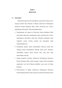 Hasil dari penelitian ini menunjukkan bahwa pengembangan diri pegawai di Sekretariat Daerah Kabupaten Blitar pada bagian administrasi pembangunan dalam monitoring dan evaluasi pembangunan infrastruktur masih ditemui keterbatasan Sumber daya Manusia. Kemampuan pegawai dalam memanfaatkan teknologi cukup baik, dengan memanfaatkan teknologi memudahkan pegawai dalam mencari solusi yang tepat untuk permasalahan yang ada. Selain itu, jenjang akademik di Bagian Administrasi Pembangunan Sekretariat Daerah Kabupaten Blitar sudah mumpuni, namun karena keterbatasan personil sumber daya manusia pemantauan yang dilaksanakan menjadi kurang maksimal. Profesionalisme di Bagian Administrasi Pembangunan Sekretariat Daerah Kabupaten Blitar sudah cukup baik. Keahlian di Bagian Administrasi Pembangunan sudah sesuai dengan bidang pekerjaannya. Adapun kendala yang dihadapi di bagian Administrasi Pembangunan Sekretariat Daerah Kabupaten Blitar yang paling utama adalah terbatasnya Sumber daya Manusia.