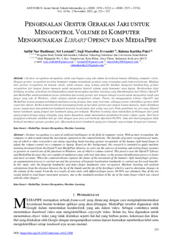 recognition jari tangan kanan manusia untuk mengantur kontrol volume pada komputer atau laptop. Berdasarkan latar belakang tersebut, penelitian ini dimaksudkan untuk menerapkan machine learning yang dikembangkan dari library OpenCV dan MediaPipe untuk melakukan proses pelatihan dan testing gesture jari tangan sebagai isyarat untuk mengontrol salah satu fungsi yang ada di Windows, salah satunya adalah mengontrol volume. Proses ini menggunakan Library OpenCV dan MediaPipe karena mampu melakukan multiprocessing dengan data yang real-time, sehingga proses identifikasi gesture lebih cepat dan akurat. Ketika kamera/webcam menangkap frame pergerakan gesture jari tangan kanan manusia, maka dilakukan proses augmentasi dan pemberian landmark keypoint localization dari setiap ruas jari. Pada penelitian ini, jari yang dikenali hanya landmark ujung jempol dan landmark ujung jari telunjuk. Machine learning akan melakukan perhitungan dari jarak ujung jempol dengan ujung telunjukn yang mana digunakan untuk menentukan perubahan besaran volume suara. Dari hasil pengujian sebanyak sembilan kali uji coba dengan pose-pose jari berbeda diperoleh 88,89%. Satu dari hasil pengujian tidak berhasil membaca gesture gerakan jari, dikarenakan posisi landmark ujung jari telunjuk yang tertutup dengan jari lainnya.