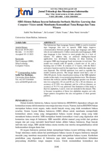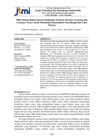 Nur Budiman, Saiful and Lestanti, Sri and Yuana, Haris SIBI (Sistem Bahasa Isyarat Indonesia) berbasis Machine Learning dan Computer Vision untuk Membantu Komunikasi Tuna Rungu dan Tuna Wicara. Jurnal Teknologi dan Manajemen Informatika. ISSN 1693-6604