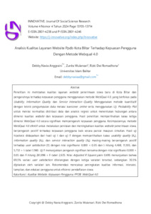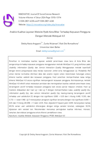 Anggraini, Debby Navia and Wulansari, Zunita and Romadhona, Rizki Dwi (2024) ANALISIS KUALITAS LAYANAN WEBSITE PPDB KOTA BLITAR TERHADAP KEPUASAN PENGGUNA DENGAN METODE WEBQUAL 4.0. Other thesis, Universitas Islam Balitar.
