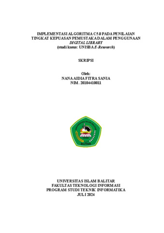 Sania, Nana Aidia Fitra (2024) IMPLEMENTASI ALGORITMA 5.0 PADA PENILAIAN TINGKAT KEPUASAN PEMUSTAKA DALAM PENGGUNAAN DIGITAL LIBRARY (studi kasus: UNISBA E-Resourch). Other thesis, Universitas Islam Balitar Blitar.