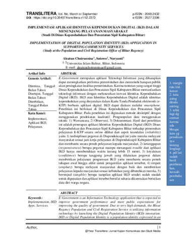 E-Government merupakan aplikasi Teknologi Informasi yang diharapkan dapat meningkatkan performa pemerintahan dan memenuhi harapan publik akan peningkatan kualitas pemerintahan. Karena tuntutan yang sangatlah tinggi Dinas Kependudukan dan Pencatatan Sipil Kabupaten Blitar memanfaatkan teknologi informasi dengan meluncurkan inovasi Identitas Kependudukan Digital (IKD). IKD atau Identitas Kependudukan Digital adalah identitas kependudukan yang dinyatakan dalam Kartu Tanda Penduduk elektronik (KTP-e/e-KTP) berbasis aplikasi digital. IKD dapat diakses melalui smartphone.