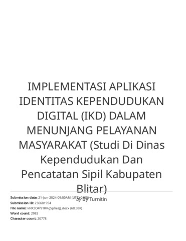 Alea, Aleatun Choirunnisa (2024) IMPLEMENTASI APLIKASI IDENTITAS KEPENDUDUKAN DIGITAL(IKD) DALAM MENUNJANG PELAYANAN MASYARAKAT (Studi di Dinas Kependudukan dan Pencatatan Sipil Kabupaten Blitar). Other thesis, Universitas Islam Balitar Blitar.