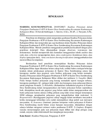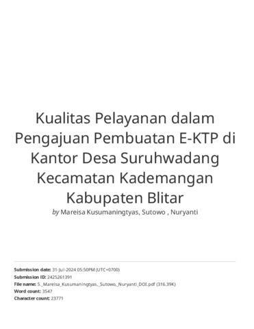 Mareisa Kusumaningtyas, Mareisa (2024) KUALITAS PELAYANAN DALAM PENGAJUAN PEMBUATAN E-KTP DI KANTOR DESA SURUHWADANG KECAMATAN KADEMANGAN KABUPATEN BLITAR. Other thesis, Universitas Islam Balitar, Blitar.