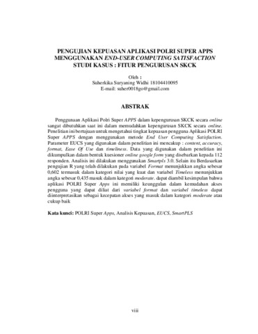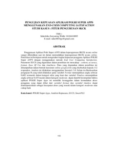 Suherkika Suryaning, Widhi (2024) PENGUJIAN KEPUASAN APLIKASI POLRI SUPER APPS MENGGUNAKAN END-USER COMPUTING SATISFACTION STUDI KASUS : FITUR PENGURUSAN SKCK. Other thesis, Universitas Islam Balitar, Blitar.