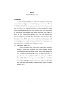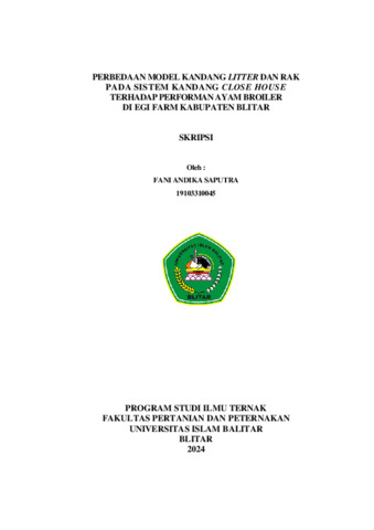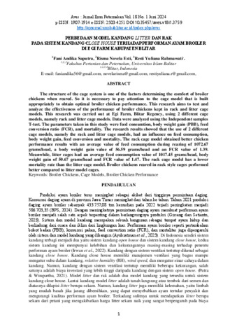 Produksi ayam broiler terus mengalami peningkatan di Jawa Timur akibat dari meningkatnya permintaan konsumsi daging ayam. Meningkatnya jumlah produksi daging ayam juga perlu diperhatikan tentang pemeliharaan yang dilakukan oleh peternak. Struktur sistem perkandangan merupakan salah satu faktor penentu kenyamanan ayam broiler saat dipelihara. Sistem kandang dan model kandang yang dibangun oleh peternak juga menentukan hasil performan produksi ayam broiler. Di Indonesia sistem kandang yang sering dijumpai adalah sistem kandang close house dan open house. Model kandang yang sering dijumpai adalah litter dan rak. Pada program penelitian yang dilakukan di Egi Farm Kabupaten Blitar memiliki tujuan untuk memberikan pengetahuan berupa pengaruh performan ayam broiler terhadap dua model kandang yang berbeda yaitu model kandang rak dan litter.