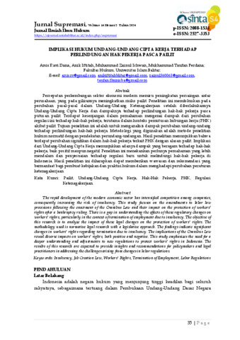 Dana, Arsis Ravi (2024) IMPLIKASI HUKUM UNDANG-UNDANG CIPTA KERJA TERHADAP PERLINDUNGAN HAK PEKERJA PASCA PAILIT. Implikasi Hukum Undang-Undang Cipta Kerja terhadap Perlindungan Hak Pekerja Pasca Pailit, 14 (2). pp. 35-51.