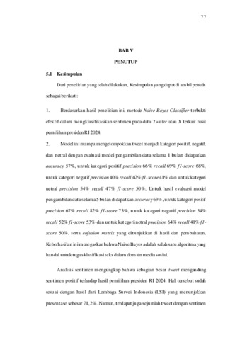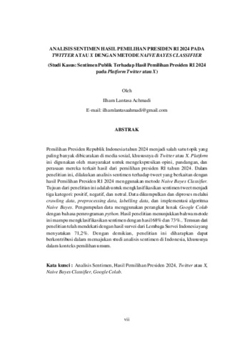 Achmadi, Ilham Lantasa and Yuana, Haris and Rahmat, Mohammad Faried (2024) ANALISIS SENTIMEN HASIL PEMILIHAN PRESIDEN RI 2024 PADA TWITTER ATAU X DENGAN METODE NAIVE BAYES CLASSIFIER. Other thesis, Universitas Islam Balitar, Blitar.