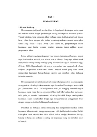 Keamanan merupakan aspek krusial dalam kehidupan modern, terutama untuk perlindungan barang berharga dan informasi pribadi. Pengembangan sistem keamanan yang handal menjadi penting, terutama dalam pengamanan loker yang berfungsi menyimpan barang-barang berharga dengan tingkat keamanan tinggi. Sistem penguncian modern, seperti teknologi sensor sidik jari, lebih efisien daripada penguncian konvensional karena mengidentifikasi individu berdasarkan garis-garis unik pada jari mereka, mengurangi risiko kehilangan kunci manual, dan meningkatkan keamanan secara keseluruhan.