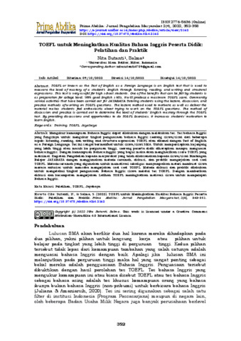 Sutanti, Nita and Salma, Salma (2022) TOEFL untuk Meningkatkan Kualitas Bahasa Inggris Peserta Didik: Pelatihan dan Praktik. Prima Abdika: Jurnal Pengabdian Masyarakat, 2 (4). pp. 352-358. ISSN 2776-5636