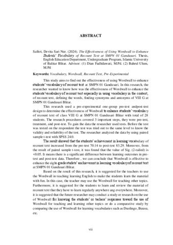 Safitri, Devita Sari Nur Safitri (2024) THE EFFECTIVENESS OF USING WORDWALL TO ENHANCE STUDENTS’ VOCABULARY OF RECOUNT TEXT AT SMPN 01 GANDUSARI. Other thesis, Universitas Islam Balitar, Blitar.