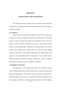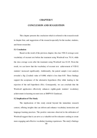 Based on the result of this research, it is suggested for the teachers to use the Wordwall in teaching learning English to make the students learn the material with fun. In this case, the teacher may use the Wordwall for teaching other topics. Furthermore, it is suggested for the students to learn and review the material of recount text that they have to learn regularly anywhere ang everywhere. Moreover, it is suggested that the future researcher may conduct a study or research on the use of Wordwall for knowing the students’ or tachers’ responses toward the use of Wordwall for teaching and learning other topics or do a comparative study by comparing the use of Wordwall for learning vocabularies such as Duolingo, Buusu, etc.