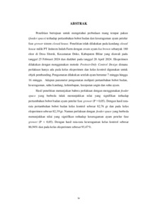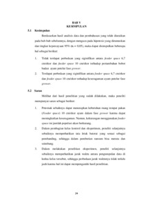Hasil penelitian menunjukan bahwa perlakuan dengan menggunakan feeder space yang berbeda tidak menunjukkan nilai yang signifikan terhadap pertambahan bobot badan ayam petelur fase grower (P > 0,05). Dengan hasil rata-rata pertambahan bobot badan kelas kontrol sebesar 82,76 gr dan pada kelas eksperimen sebesar 82,39 gr. Namun perlakuan dengan feeder space yang berbeda menunjukkan nilai yang signifikan terhadap keseragaman ayam petelur fase grower (P < 0,05). Dengan hasil rata-rata keseragaman kelas kontrol sebesar 86,94% dan pada kelas eksperimen sebesar 93,47%.