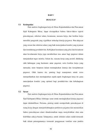 Penelitian ini menganalisis berbagai aspek lingkungan kerja di Dinas Kependudukan dan Pencatatan Sipil Kabupaten Blitar dan bagaimana aspek-aspek tersebut mempengaruhi kinerja pegawai. Aspek yang dianalisis meliputi pencahayaan, sirkulasi udara, kebisingan, bau tidak sedap, keamanan, suasana kerja, hubungan dengan rekan kerja, dan fasilitas kerja.