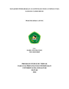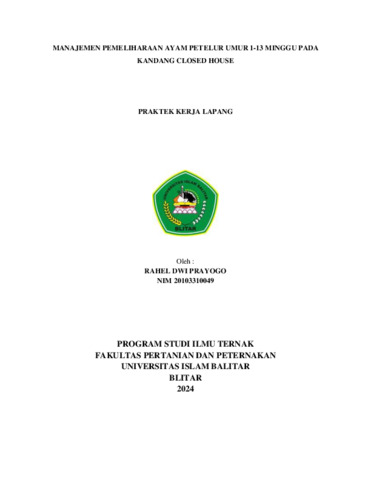 Rahel, Dwi Prayogo (2024) MANAJEMEN PEMELIHARAAN AYAM PETELUR UMUR 1-13 MINGGU PADA KANDANG CLOSED HOUSE. Technical Report. UNIVERSITAS ISLAM BALITAR, BLITAR. (Unpublished)