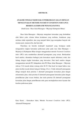 Penelitian ini bersifat deskriptif kuantitatif yang bertujuan untuk menganalisis tingkat kerusakan perkerasan jalan pada ruas Jalan Binangun – Mojorejo di Kabupaten Blitar dengan menggunakan metode Pavement Condition Index (PCI) serta memberikan alternatif penanganan yang sesuai. Berdasarkan hasil analisis, ditemukan berbagai jenis kerusakan seperti deformasi, retak, dan lubang dengan tingkat kerusakan yang bervariasi. Dari hasil analisis dengan menggunakan metode PCI didapatkan nilai PCI Ruas Jalan Binangun – Mojorejo sebesar 51,8 masuk dalam rentang nilai 40-55. Dari hasil ini dapat bahwa ruas jalan tersebut masuk dalam kategori Sedang (Poor). Untuk alternatif penanganan dibagi menjadi skala prioritas I alternatif penanganan kerusakan jalan dengan rekonstruksi jalan, skala prioritas II alternatif penanganan kerusakan jalan dengan pemeliharaan jalan secara berkala, dan skala prioritas III alternatif penanganan kerusakan jalan dengan pemeliharaan rutin guna meningkatkan umur layanan dan kualitas perkerasan jalan.